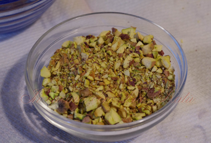 Prendete i pistacchi e tritateli con un coltello o con un tritatutto. Importante è che non li sminuzziate troppo. Io ho scelto di tritarli con un coltello, anche perché non serve molto tempo.