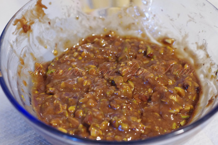 Aggiungete anche la crema bianca e i pistacchi tritati. Amalgamate bene il tutto.