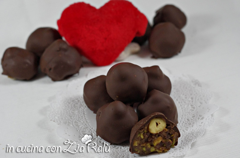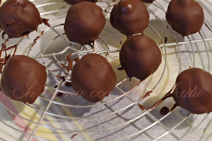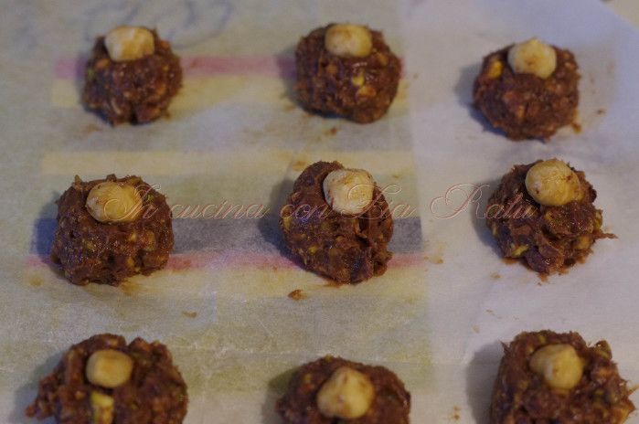 Prendete il composto con un cucchiaino e formate 12 palline. Mettete le palline su un vassoio coperto di carta da forno e metteteci sopra una nocciola ciascuna. Mettete le palline così formate di nuovo ne freezer per un’ora.