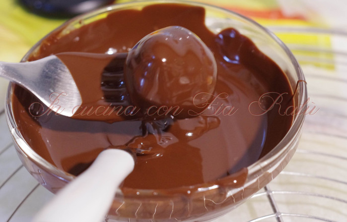 Prendete il cioccolato fondente e fatelo sciogliere bene a bagnomaria o se preferite al forno a microonde. Quando il cioccolato fondente sarà sciolto prendete ogni pallina e tuffatela nel cioccolato. Fatela rotolare bene e con un cucchiaino mettetela su una grata per dolci aiutandovi anche con una forchetta. Fate l’operazione di copertura di tutti i baci e fateli riposare fino a che il cioccolato sarà solidificato.