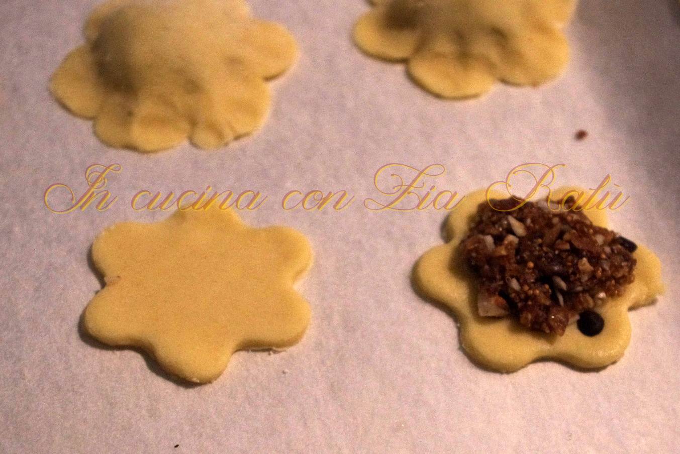 Riprendete l’impasto e stenderlo su una superficie infarinata con uno spessore di circa 2mm. Tagliate le formine di pasta e riporli su una teglia ricoperta di carta da forno, al centro di ogni fiore mettere un cucchiaino di ripieno Ricoprire con un fiore di pasta più grande di un cm e premere tutto intorno ai bordi per sigillare la frolla.