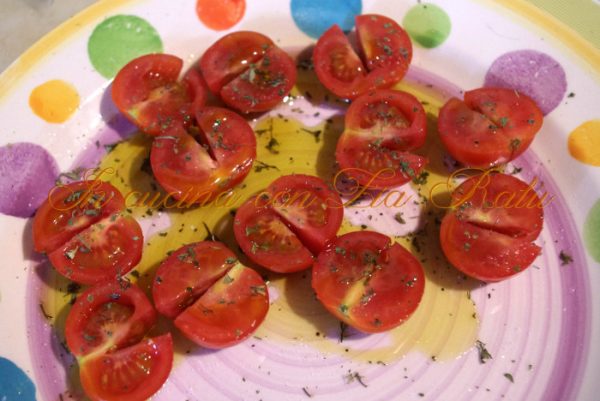 Prendete ora le olive e tagliate ciascun frutto in quattro parti uguali. Girate i pomodorini con la parte della polpa rivolta verso l’altro su di un piatto piano e conditeli con sale, mentuccia essiccata e olio evo.