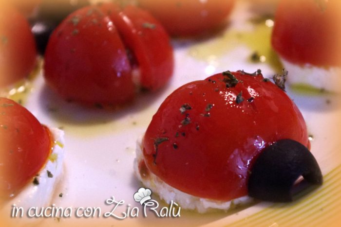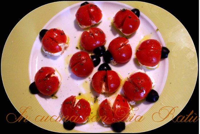 Sappiate che questo antipasto non rimane mai perché fresco e delicato. Ottima alternativa è di mettere come base di ogni coccinella del pan carré o dei ritz su cui spalmare direttamente il formaggio e poi adagiarvi i pomodorini.