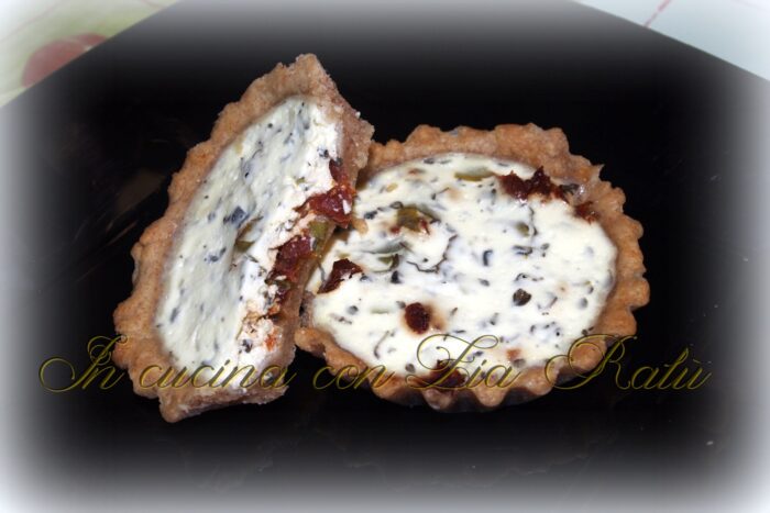Tritate nel tritatutto i pomodorini secchi senza sgocciolarli. Nel fondo delle crostatine stendete un po’ del trito di pomodori secchi.
