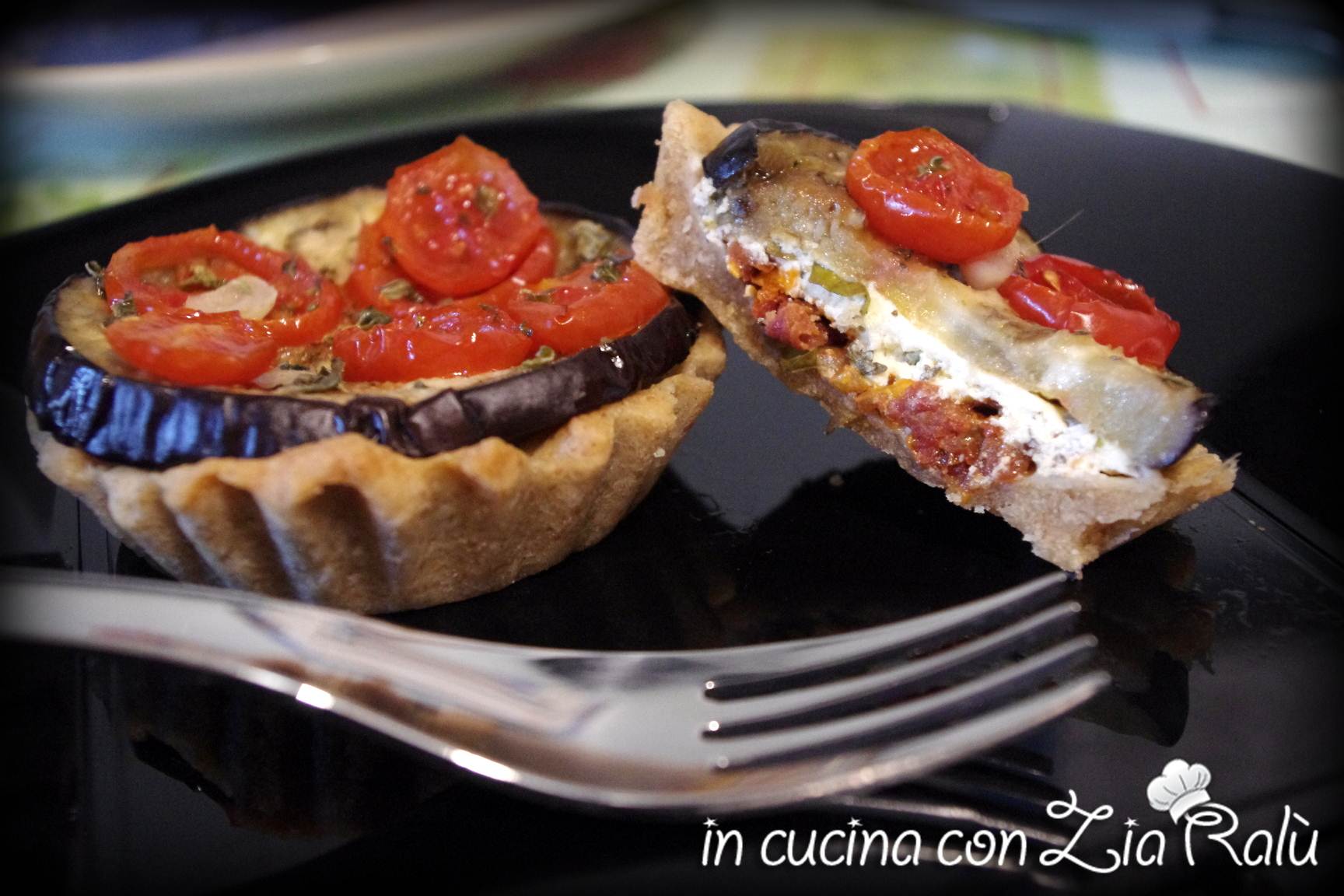 A questo punto prendete le fettine di melanzane e mettetene una su ogni crostatina.