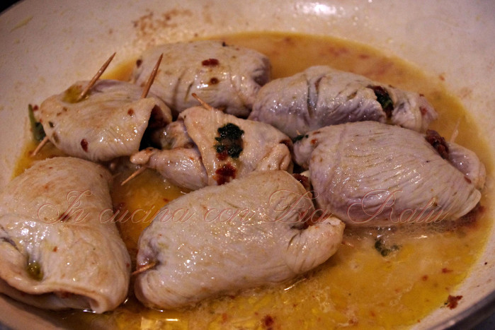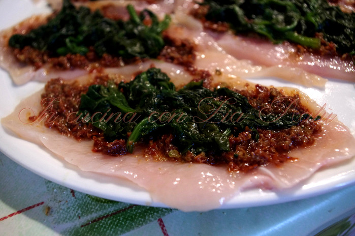 Preparazione degli involtini pollo spinaci pomodori secchi e pinoli