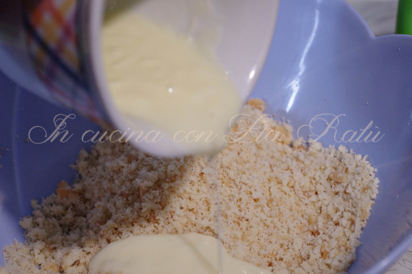 Sbriciolate con le mani le lingue di gatto necessarie. Fate sciogliere il burro o sul fornello o al microonde e versatelo sulle code di gatto sbriciolate. Mescolate bene anche con le mani o con l’ausilio di una forchetta.