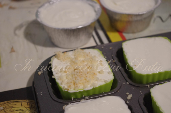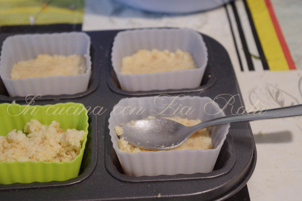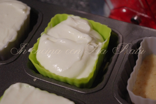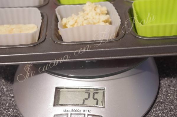 Prendete 25 g di impasto base e con un cucchiaino compattatelo nel fondo delle formine. Quando avrete terminato questa operazione mettete le formine nel freezer.
