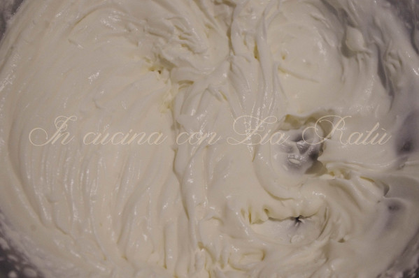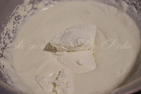 Montate la panna fredda di frigo con lo zucchero e l’agar agar. Aggiungete ora la Philadelphia light e mescolate ancora con lo sbattitore. Aggiungete infine la ricotta e amalgamate bene.