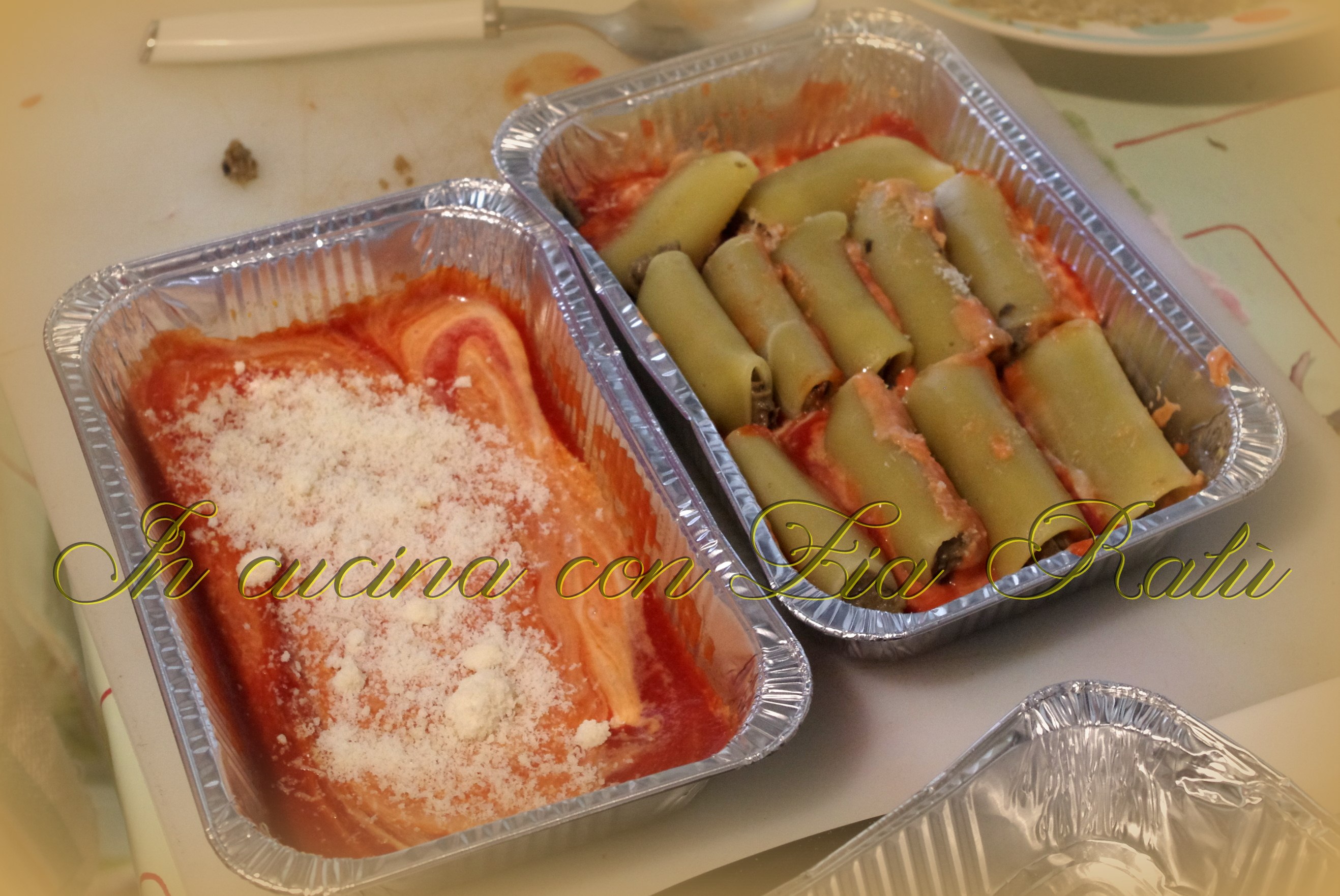 Completato il riempimento/posizionamento dei paccheri, copriteli con abbondante pomodoro e besciamella.
