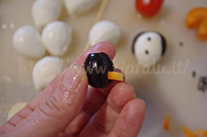 Potrete decidere di optare per una delle seguenti opzioni. Infilate l’oliva orizzontalmente lasciando i fori del nocciolo proprio a formare il viso. Nel foro più grande infilateci il triangolo di carota.