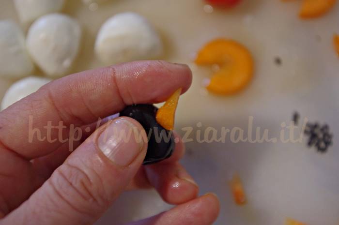Preparazione dei pinguini olive carote e mozzarelline