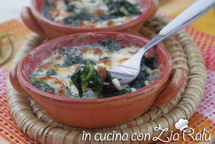 Metteteli a lessare per 10 minuti in acqua leggermente salata, scolateli e versateli in una teglia o come ho fatto io in cocotte monoporzione unte con l’olio.