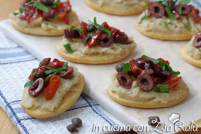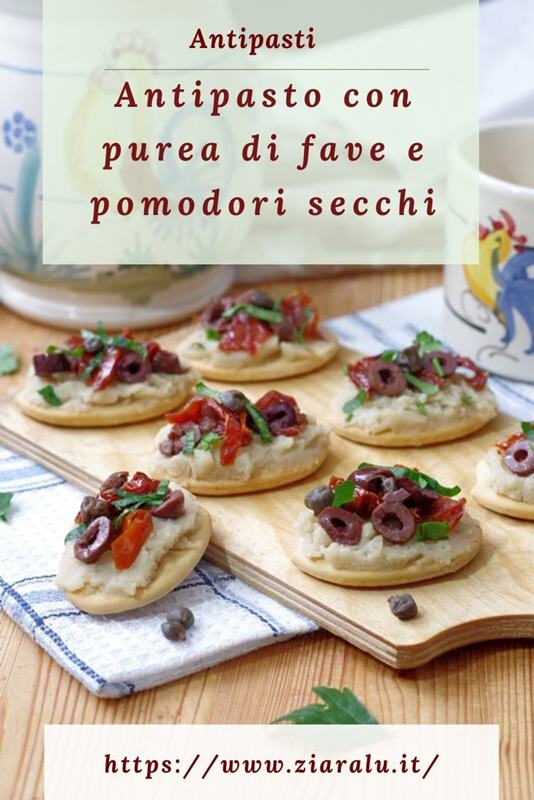 L’antipasto con purea di fave e pomodori secchi è una ricetta che potrebbe rientrare tra le ricette pugliesi in quanto gli ingredienti per prepararla sono tutti tipici di questa regione. Il purè di fave è una delle preparazioni della tradizione contadina pugliese che normalmente si serve insieme alla cicoria di campo lessa; i pomodori secchi sott’olio sono comunque caratteristici di tutto il sud Italia. Le olive leccine sono una varietà tipica salentina, ed infine i capperi, quei boccioli che tanto sono buoni e che ogni anno preparo accuratamente sotto sale e sotto aceto; sono caratteristici anche del territorio pugliese (i più noti ed apprezzati sono quelli di Pantelleria).