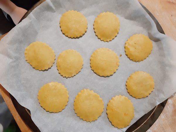Prendete ora tutti i cerchi di pasta frolla più piccoli e disponeteli distanziati sulla teglia pronta.