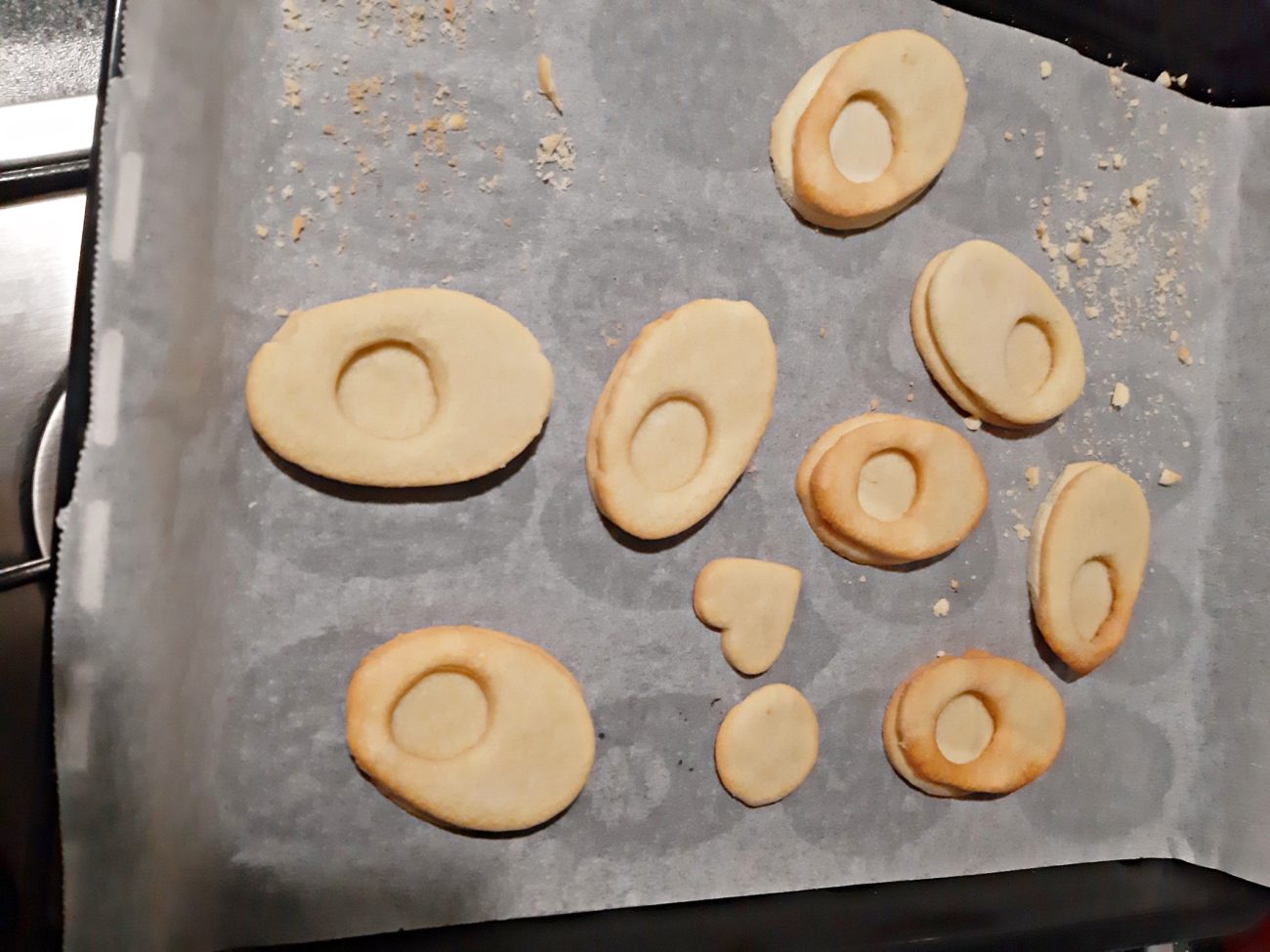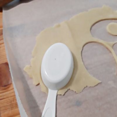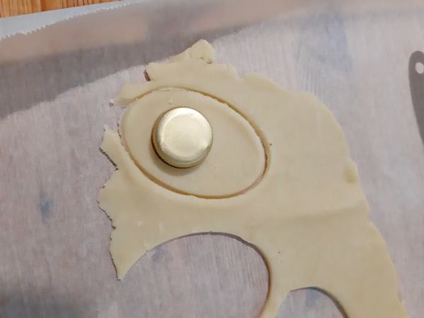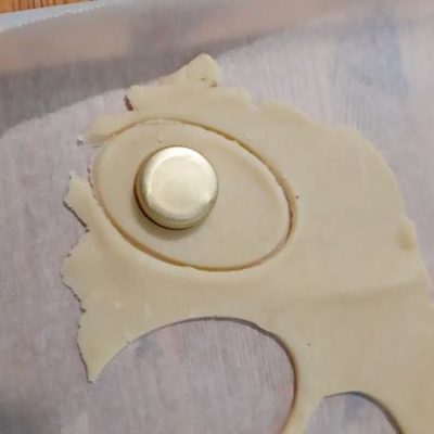 Dopo il riposo in frigo riprendete la pasta frolla e stendetela allo spessore di 3 – 4 mm. Con l’apposito coppa pasta o con dei mezzi di fortuna come ho fatto io, tagliate i biscotti a forma di uovo. In metà dei biscotti ottenuti tagliate un foro rotondo. Cercate di impiegare poco tempo per evitare che la pasta frolla si scaldi nuovamente.