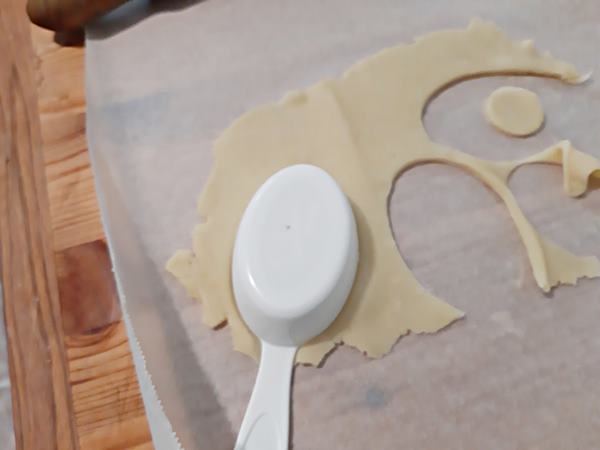 Dopo il riposo in frigo riprendete la pasta frolla e stendetela allo spessore di 3 – 4 mm. Con l’apposito coppa pasta o con dei mezzi di fortuna come ho fatto io tagliate i biscotti a forma di uovo. In metà dei biscotti ottenuti tagliate un foro rotondo. Cercate di impiegare poco tempo per evitare che la asta frolla si scaldi nuovamente. |
