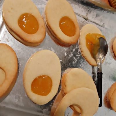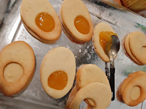Prendete la gelatina di arance e ammorbiditela mescolandola bene. Mettere un cucchiaino di gelatina sulle basi senza foro e distribuitela bene poi poggiate il biscotto con il foro sopra alla confettura e al biscotto ovale senza buco.