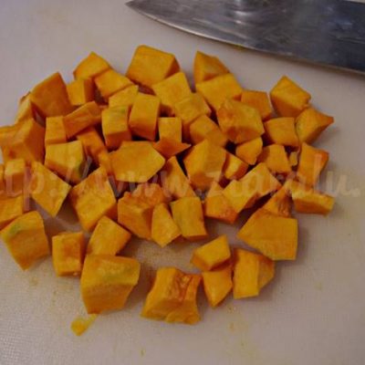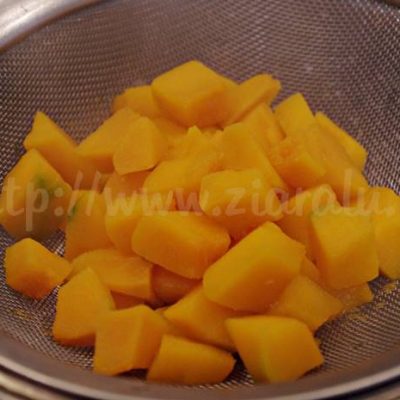 Innanzi tutto iniziate pulendo la zucca dalla buccia e tagliandola a cubetti. Mettete la zucca a cubetti in un tegame con dell’acqua e lessatela per 10 minuti poi scolatela e fatela raffreddare.