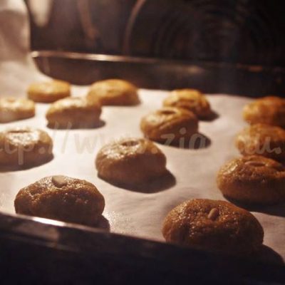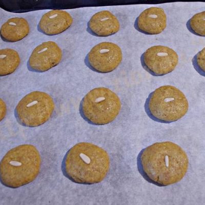 Fate venti palline con la pasta poi disponetele sulla teglia. Schiacciatele leggermente e mettete al centro un pinolo su ogni biscotto.