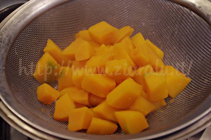 Innanzi tutto iniziate pulendo la zucca dalla buccia e tagliandola a cubetti. Mettete la zucca a cubetti in un tegame con dell’acqua e lessatela per 10 minuti poi scolatela e fatela raffreddare.