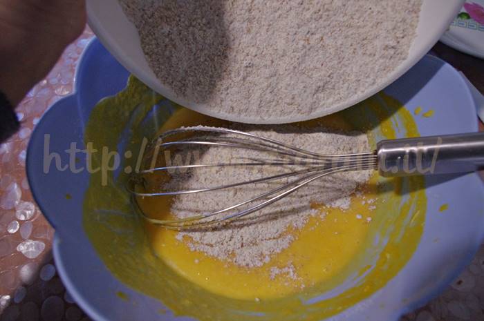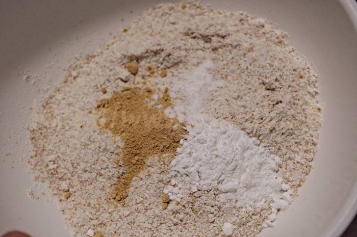Setacciate la farina e mescolatela insieme al cucchiaino di zenzero, il lievito, la vanillina, e la farina di mandorle.