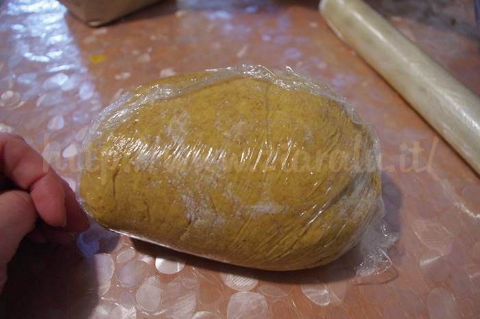 Fate ora una palla con la pasta ottenuta e foderatela con pellicola trasparente, mettete la pasta in frigo a riposare per 1 ora.