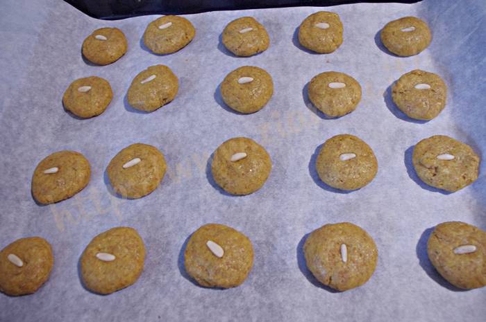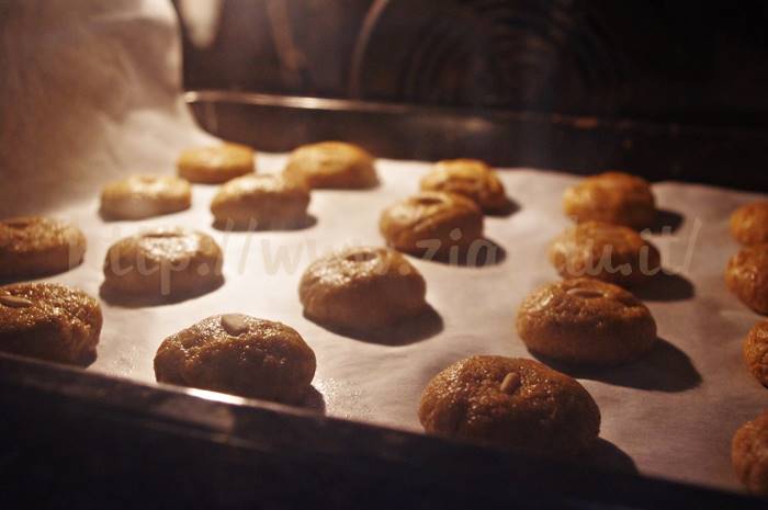 Fate venti palline con la pasta poi disponetele sulla teglia. Schiacciatele leggermente e mettete al centro un pinolo su ogni biscotto.