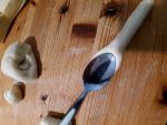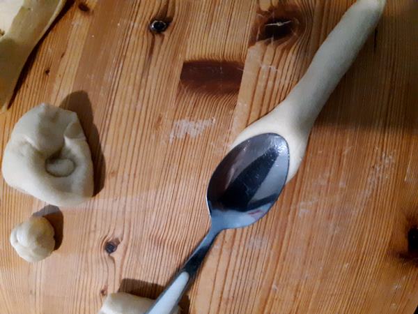 Con il pezzo più grande formate un cordoncino di circa 20 cm di lunghezza. Con un cucchiaio schiacciate uno degli estremi e annodate la restante parte di pasta con un nodo semplice. Praticate alcuni tagli nella parte schiacciata col cucchiaio formando la coda delle vostre colombine.