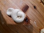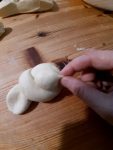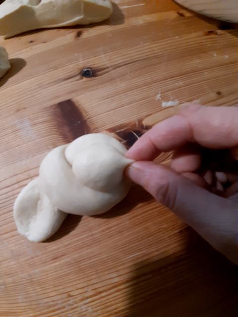 Formate una pallina con la parte più piccola di pasta e attaccatela bene nella parte del nodo, magari spennellando la parte del nodo con poca acqua.