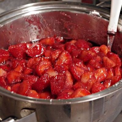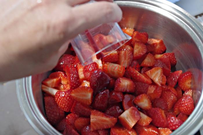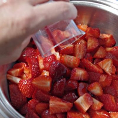 Nel caso vogliate utilizzare il fruttapec dovrete dividere le fragole 1 kg per volta aggiungere 100 ml di succo di mirtillo per ogni kg di fragole. Mescolate fragole succo e una bustina di fruttapec e portate a ebollizione per 1 minuto. A questo punto aggiungete lo zucchero (1 kg, 500 gr o 350 gr a seconda che il fruttapec sia rispettivamente 1:1, 2:1, 3:1) e fate bollire per circa 5 minuti.