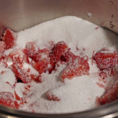 Togliete il picciolo alle fragole e tagliatele a pezzetti.