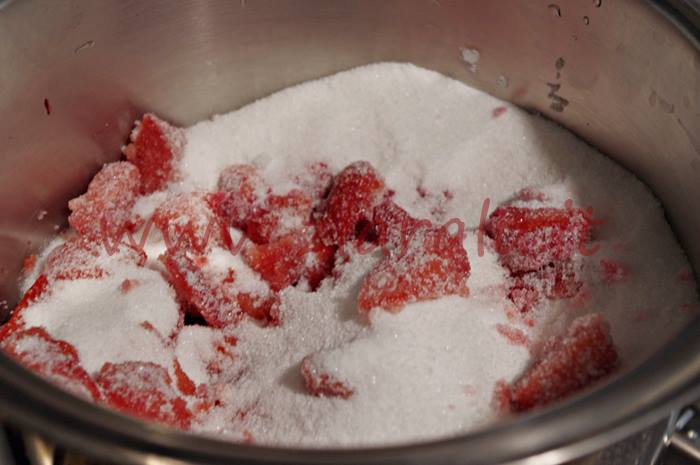 Aggiungete lo zucchero e mescolate bene. Fate bollire il composto per circa 40 50 minuti. Fate la prova del piattino per vedere se la confettura è fatta. |