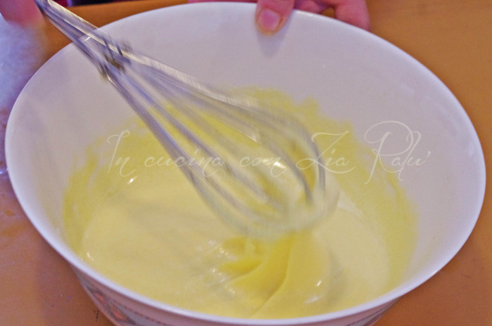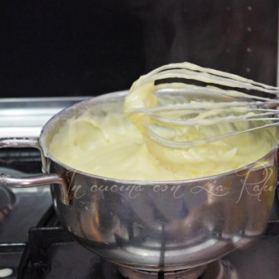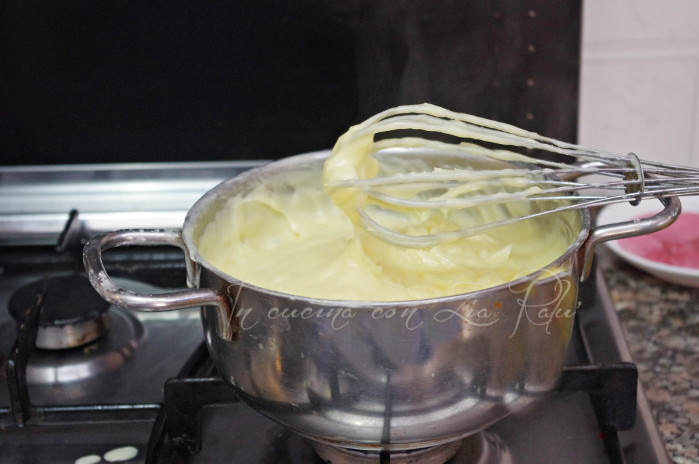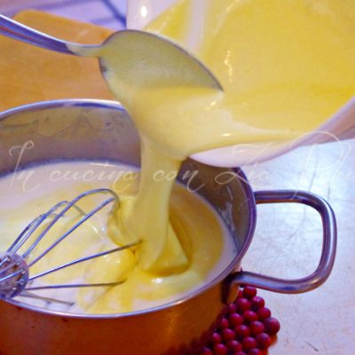 Quando il latte inizierà a bollire, togliete la pentola dal fuoco e con un cucchiaio aggiungete poco latte alle uova e farina sbattute e ammorbidite l’impasto. Versatelo poi nel tegame del latte e mescolate bene affinché la crema si sciolga nel latte. Rimettete la pentola sul fuoco e mescolate bene fino a che la crema non avrà raggiunto la giusta consistenza.