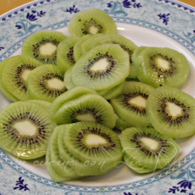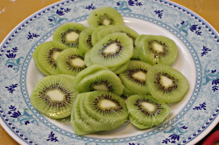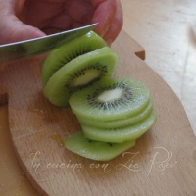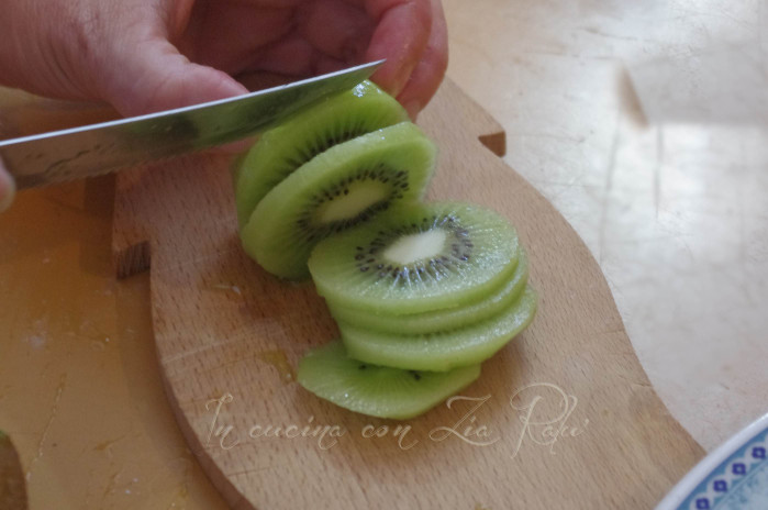 Sbucciate i kiwi e tagliateli a fettine sottili.