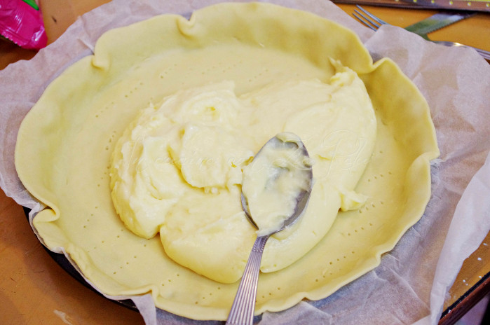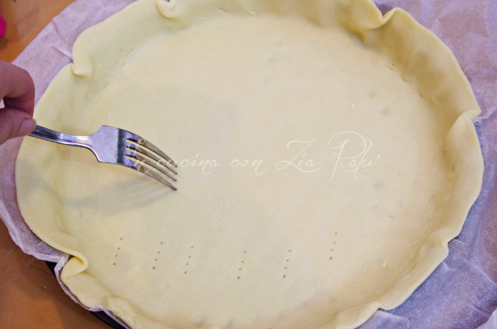 Prendete la teglia rotonda da crostata e stendeteci la pasta frolla con la sua carta da forno. Bucherellate il fondo con i rebbi di una forchetta.