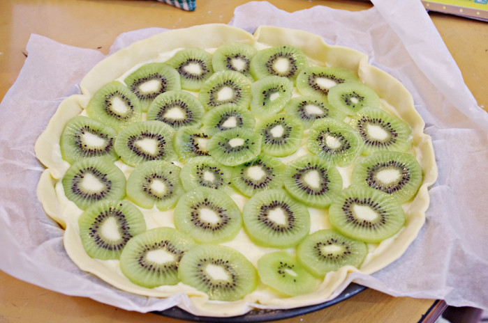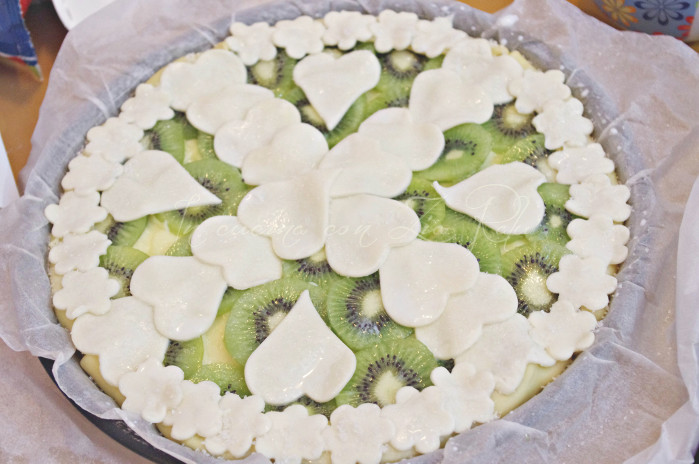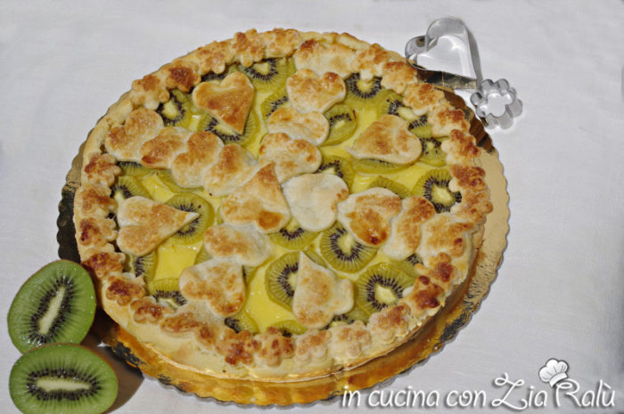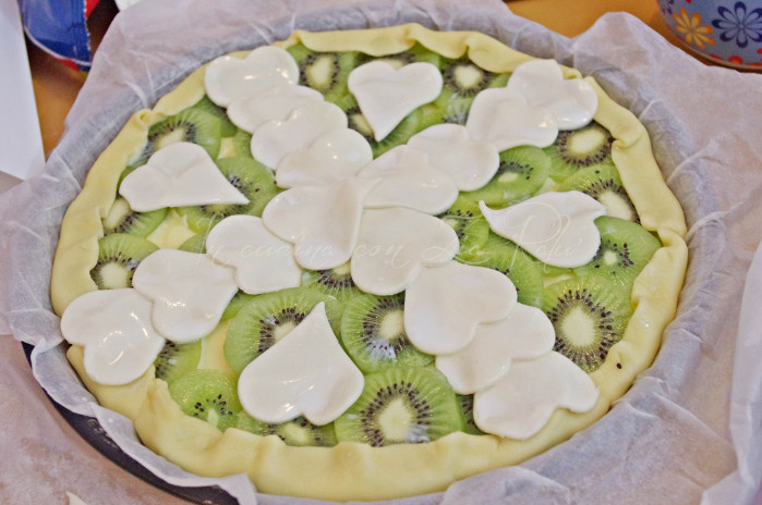 Versate la crema sul fondo di pasta frolla e livellate con un cucchiaio. Disponete le fettine di kiwi spora alla crema. Prendete ora la pasta sfoglia e con un coppa pasta a forma di cuore tagliate dei cuoricini e disponeteli sulla crostata a forma di x.