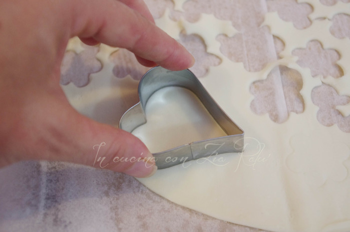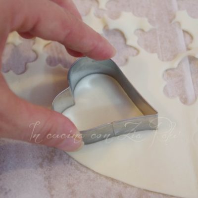 Decorazione della crostataPrendete ora la pasta sfoglia e con un coppa pasta a forma di cuore tagliate dei cuoricini e disponeteli sulla crostata a forma di x. |
