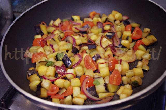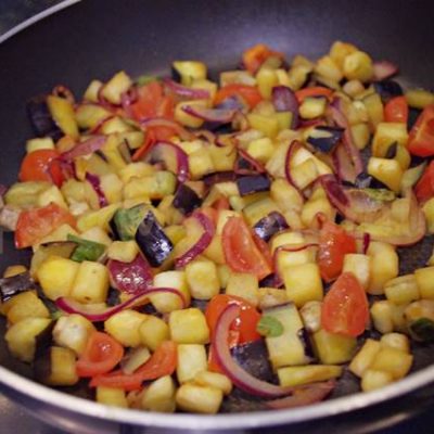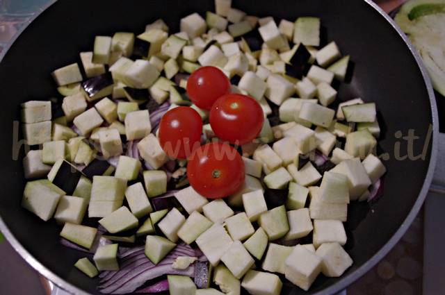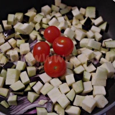 Lavate la melanzana togliete il picciolo e iniziate a tagliarla a strisce. Pesatene 150 gr e tagliatela a cubetti. Lavate e tagliate i pomodorini in quattro parti. Tagliate qualche fettina di cipolla e pesatela.