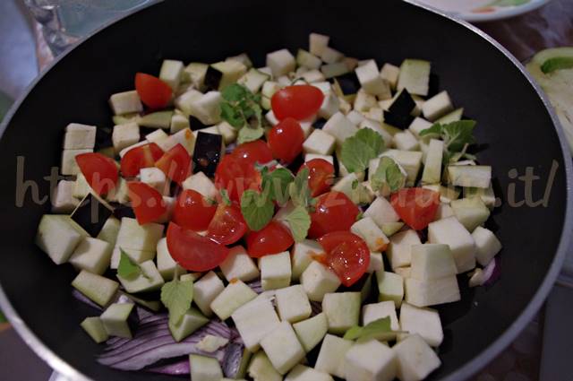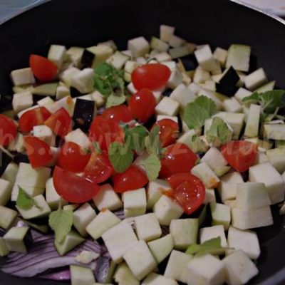In una padella de 24 cm versate un cucchiaino di olio evo la cipolla a fettine sottilissime, le melanzane a tocchetti, i pomodorini e le foglie dei due rametti di mentuccia .