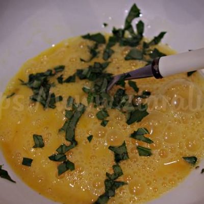 Intanto prendete 4 uova e apritele in un piatto fondo. Lavate le foglie di basilico e tagliatele a pezzettini piccolissimi. Aggiungete alle uova un pizzico di sale e il basilico tagliuzzato. Sbattete bene le uova facendo ben distribuire il basilico. |