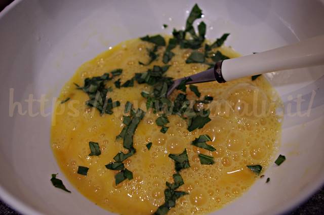 Intanto prendete 4 uova e apritele in un piatto fondo. Lavate le foglie di basilico e tagliatele a pezzettini piccolissimi. Aggiungete alle uova un pizzico di sale e il basilico tagliuzzato. Sbattete bene le uova facendo ben distribuire il basilico.