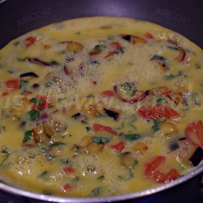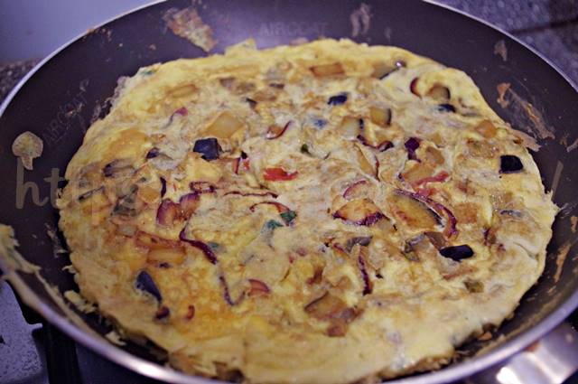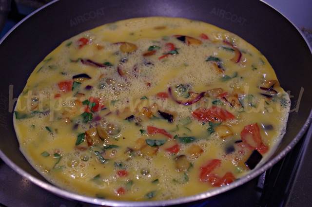 Fate cuocere bene l’uovo. Dovrete vedere che l’uovo ai lati della padella è diventato sodo e chiaro, il che significa che è cotto bene e sopra alle melanzane e pomodori deve essere poco liquido altrimenti quando girate la frittata fareste un disastro.
