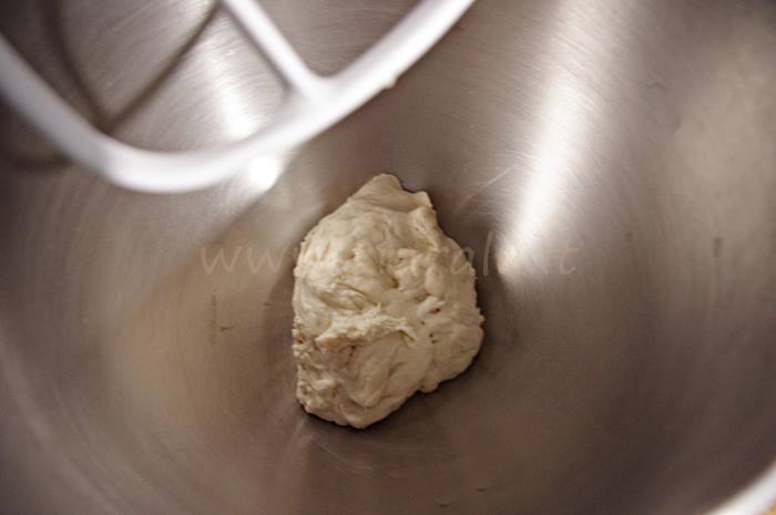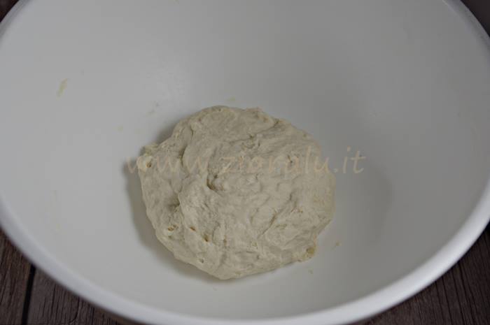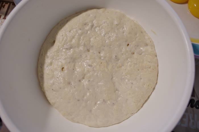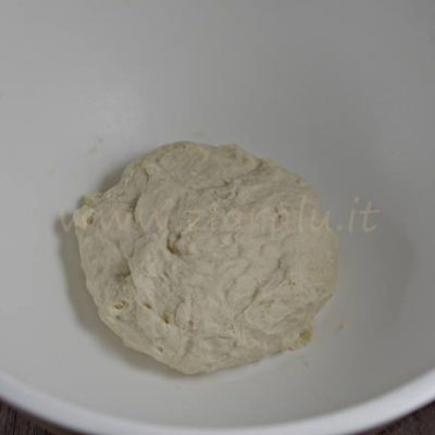 Mettete la pasta ottenuta in una ciotola copritela e fatela lievitare fino a che raddoppierà il suo volume. Ci vorranno dalle 2 alle 4 ora. Se non avete tempo potrete preparare questo impasto la sera e metterlo in frigo per 12 ore poi utilizzarlo per fare l’impasto.