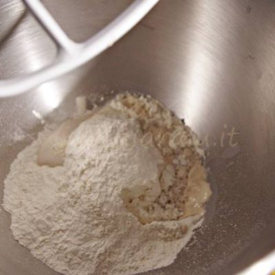 I° impastoSciogliete ½ del lievito in 75 ml di acqua tiepida e un pizzico di zucchero. Impastate ½ della farina della ricetta con il lievito sciolto. Mettete la pasta ottenuta in una ciotola copritela e fatela lievitare fino a che raddoppierà il suo volume. Ci vorranno dalle 2 alle 4 ora. Se non avete tempo potrete preparare questo impasto la sera e metterlo in frigo per 12 ore poi utilizzarlo per fare l’impasto. |