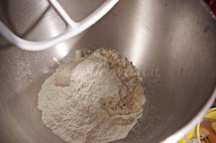 Qualsiasi sia il procedimento utilizzato prendete la pasta e mettetela nella ciotola di un impastatore. Sciogliete il rimanente lievito nel latte tiepido.
