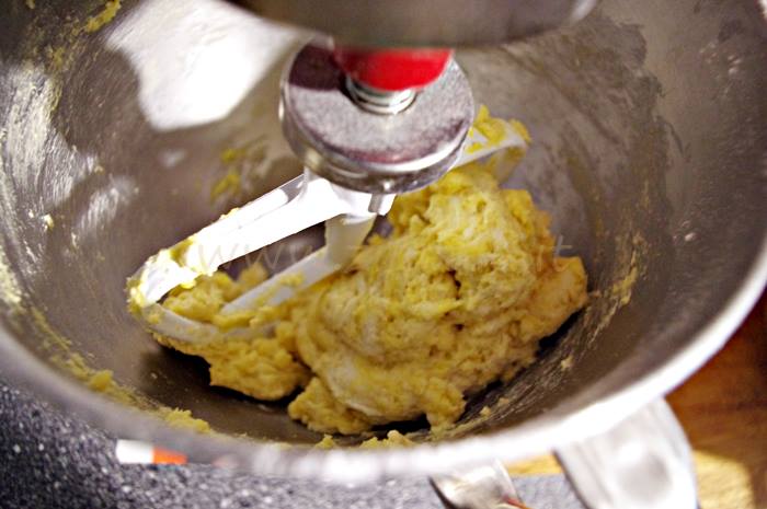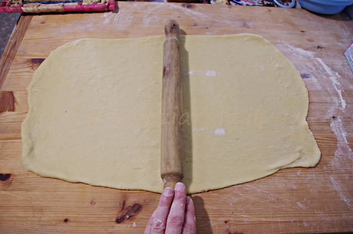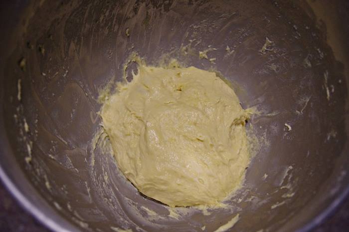 Incorporate la farina rimasta nella ciotola con l’impasto lievitato e aggiungete il latte e lievito. Incorporate lo zucchero, il burro fuso raffreddato i tuorli e fate impastare fino a che otterrete un impasto liscio e omogeneo.