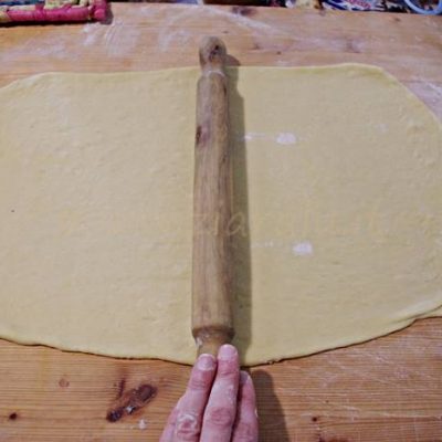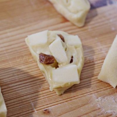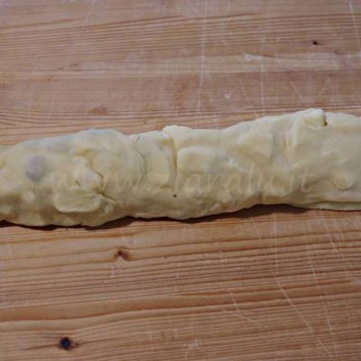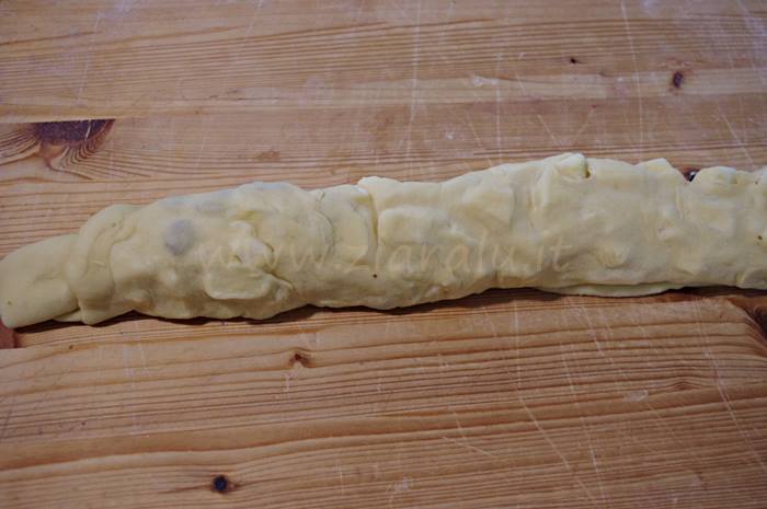 Prendete ora la pasta stendetela in un rettangolo di circa 40 cm per 25 cm. Strizzate l’uva passa e disponetela sul rettangolo di pasta.