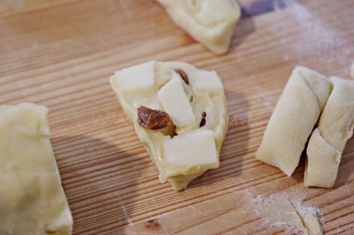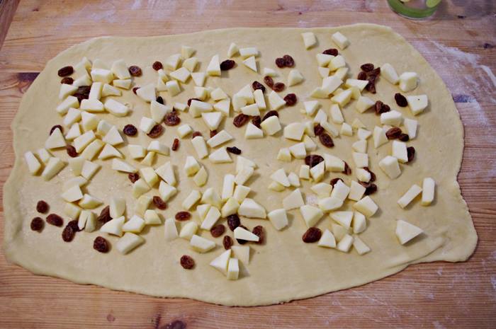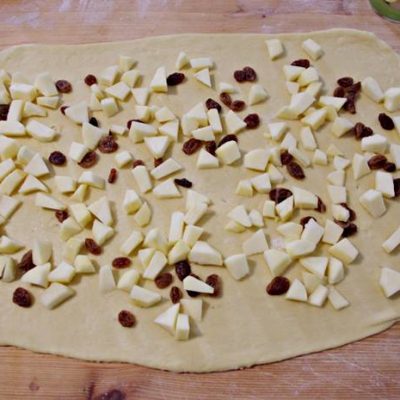 Sbucciate le mele e tagliatele a cubetti. Distribuite anche le mele nel rettangolo. Pigiate bene affinchè mele e uvetta aderiscano alla pasta e poi arrotolate bene.