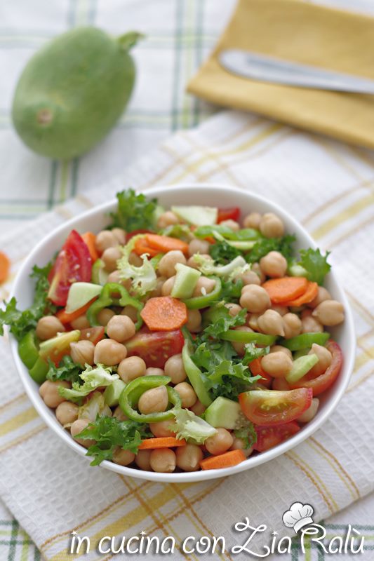 La ricetta dell’insalata di ceci e pomodori è una ricetta light può tranquillamente essere considerata un piatto unico da accompagnare con una insalata mista e un frutto. Mi rifaccio sempre alla mia vecchia dieta quando voglio creare piatti leggeri ma equilibrati.